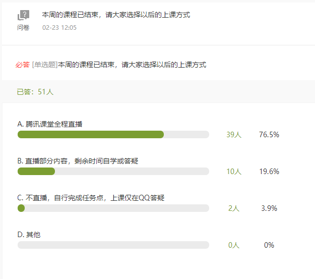 线上教学对师生都属新鲜事物,教学效果也未可知。因此,教学开展一周后,教研室组织了问卷调查,就这些教学方式进行效果分析。经调查,学生比较认可直播和超星平台组织课堂互动的方式,表明学生潜意识还是认可有规律和有纪律的学习,正如有同学说“这种方式能够很好的督促自己按时按课表学习,不至于放飞自我”。根据收集的意见和反馈,教研室及时对教学方式进行了微调,目前各项工作有序进行。