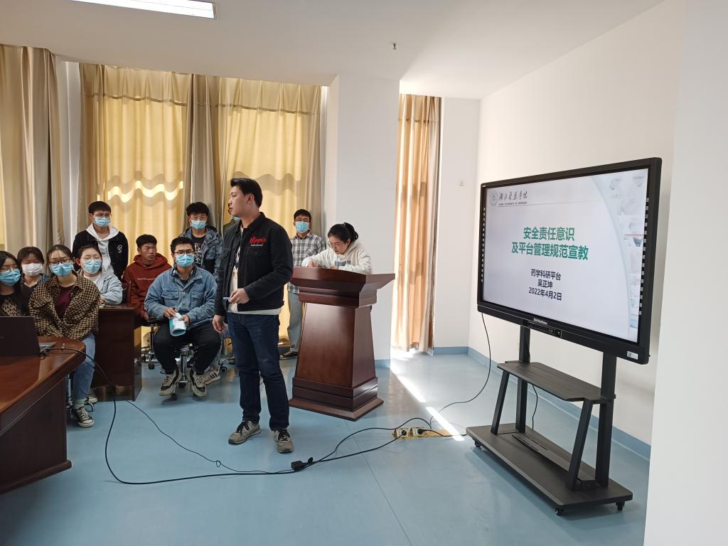 为进一步增强药学院入驻科研平台师生实验安全意识与防护技能,强化实验室安全管理、增强学生安全意识和责任心,营造良好安全的实验环境。培训分三个方面,一是重点强调了安全意识和责任心的重要性;二是介绍了危化品采购、使用、危废处理等危化品规范化管理规范及实验室水、电、气、火使用安全细则,同时结合平台已配备应急处理装置,对发生事故应急处理措施进行演示;三是强调了平台日常巡检和管理中发现的常见问题及其处理办法,重点强调了科研平台违规行为处罚办法。