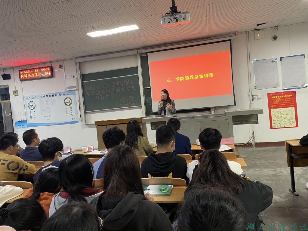 本网讯(通讯员 王艳红)为充分体现药学院国家奖学金评选工作的公平公正公开,培养优良学风,2022年10月10日17:30,药学院国家奖学金答辩暨新生学风教育大会在3401教室举行。药学院院长李飞,副院长郝新才,各科室负责人及教研室主任出席了大会,药学院2022级全体学生参加了此次活动。