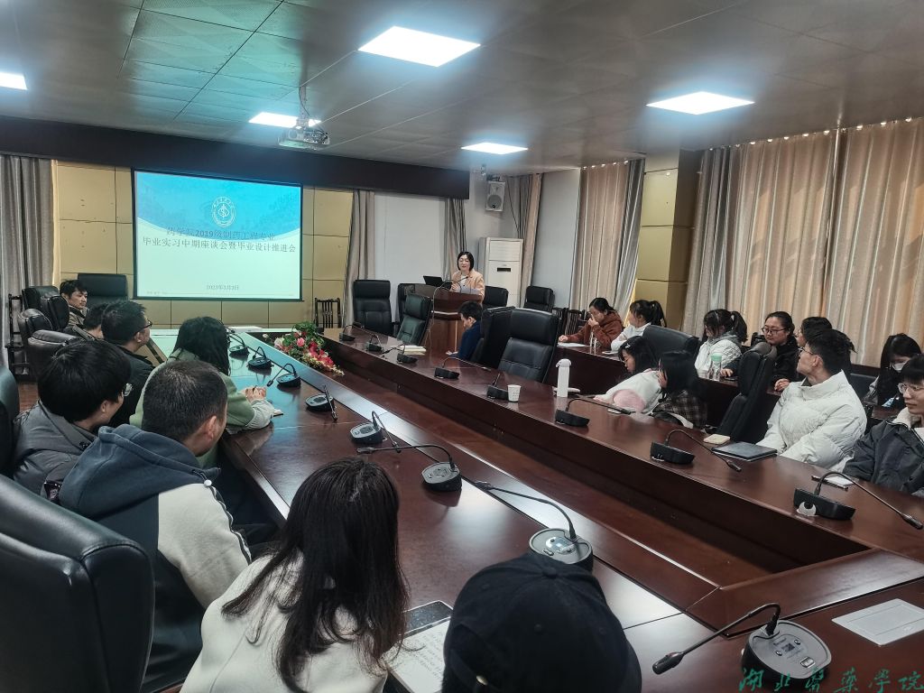 本网讯(通讯员 唐豫媛 邱婧然)2023年3月3日上午, 2019级制药工程专业毕业实习中期座谈会暨毕业设计推进会在药学院六楼会议室举行。教研室主任邱婧然、教办老师陈海立、毕业班辅导员王艳红、毕业设计(论文)指导教师及35名应届毕业生参加了会议。