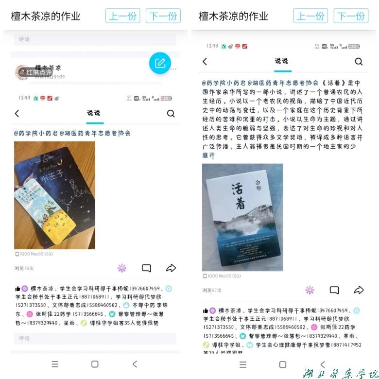 活动期间,同学们共有两种参与方式:1、推荐一本书并简述相关内容及推荐理由。2、任选一部喜欢的文学著作进行段落摘抄并制作成书签。另外在QQ群里上传自己的阅读心得体会。活动吸引了众多同学的热情参与,同学们在分享过程中,体会到阅读的乐趣,也结识了一群志同道合的朋友。