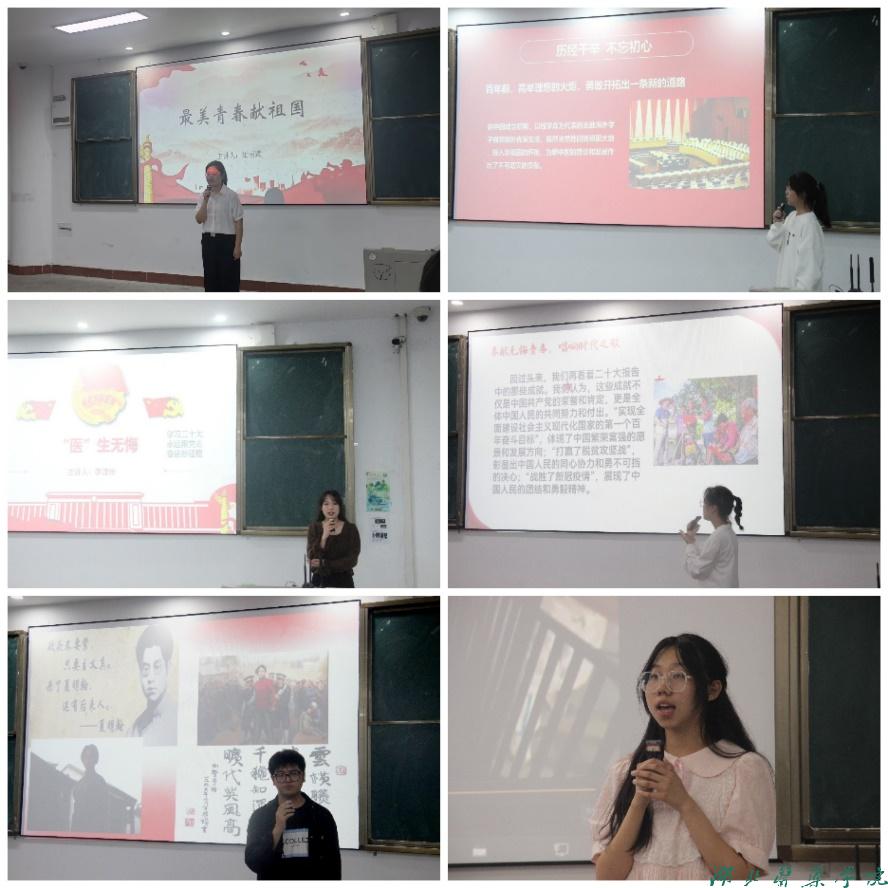 比赛共有6位选手上台演讲。他们分别是22级制药工程班李淳伶主讲的《“医”生无悔》;22级药学班樊倩主讲的《奉献无悔青春,唱响时代之歌》;22级药学班张思蕊主讲的《奋进新征程,我们一直在路上》;22级中药班谢雪芬主讲的《青年勇担当,赓续新华章》;22级药护药学班黄俊杰主讲的《我与我的党》;22级药护药学班祝梦雪主讲的《借青春之风,添时代之光》;22级制药工程班梁丽颖主讲的《最美青春献祖国》。