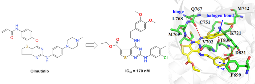 本网讯(通讯员 吴丰旭)龙年之首,药学院小分子创新药物与药用功能材料研究团队再添新成果。恶性肿瘤是目前威胁人类生命健康的重大疾病之一,抗肿瘤药物的研发趋势也从传统的细胞毒药物转为靶向细胞内特定信号转导的药物。以表皮生长因子受体(EGFR)为药物作用的靶点,通过干预EGFR信号传导进行肿瘤治疗已成为近年来抗肿瘤药物研发的热点。然而这类药物在实际治疗中都面临着毒副作用大,用药一段时间后易产生药物抗性等问题,因此研发具有新颖骨架且高效的靶向EGFR药物分子仍然具有重要意义。