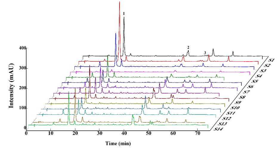 本网讯(通讯员 凌旭)桑叶是一种典型药食两用中药材,全中国大部分地区均有生产。其所含有的化学成分因产地和采摘时间不同而体现出巨大的差异。《中国药典》2020年版规定其“初霜后采收,除去杂质,晒干”后入药,并以芦丁作为质量控制的指标。然而,以单一化合物作为质量控制指标无法反映其所含成分的总体情况,且中国药典未说明其他时间段采收的桑叶能否药用。因此,需考察产地差异和采收时间差异对桑叶品质的影响。药学院凌旭课题组致力于上述问题的研究,近期在中科院二区TOP期刊《Journal of Food Composition and Analysis》(5年影响因子: 4.6)上发表了题为“Analysis of chlorogenic acid and two flavonoids in mulberry leaves of different harvest periods and origins and HPLC fingerprint study for quality control”的研究成果。该研究采用高效液相色谱法和液相色谱-质谱联用技术研究了不同采收期和产地的桑叶中的芦丁、绿原酸和紫云英苷等三种成分的含量,建立了桑叶的HPLC指纹图谱,并以Box-Behnken响应面法优化了三种成分的提取率,使含量测定结果更接近三种成分的真实含量。