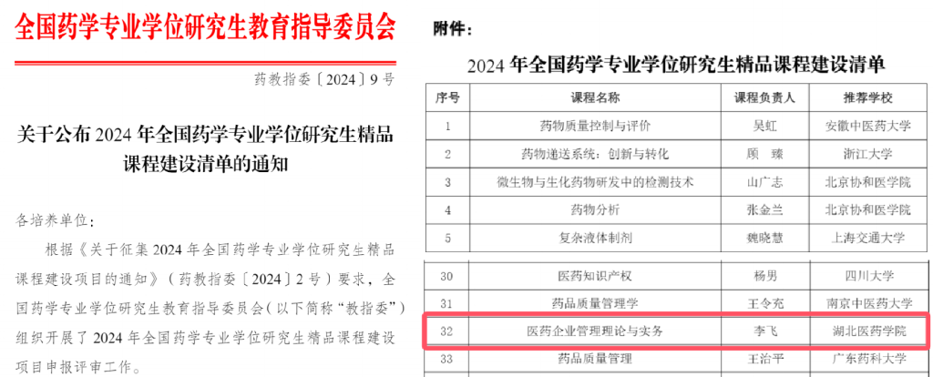 本网讯(通讯员 张艳)近日,全国药学专业学位研究生教育指导委员会公布了2024年全国药学专业学位研究生精品课程建设清单,其中,我校药学院李飞、张艳负责的《医药企业管理理论与实务》课程成功入选。此次全国共有57项申报项目被列入精品课程建设清单,湖北省仅华中科技大学和我校两所院校申报的课程入选,是我校研究生课程建设又一项重大突破。