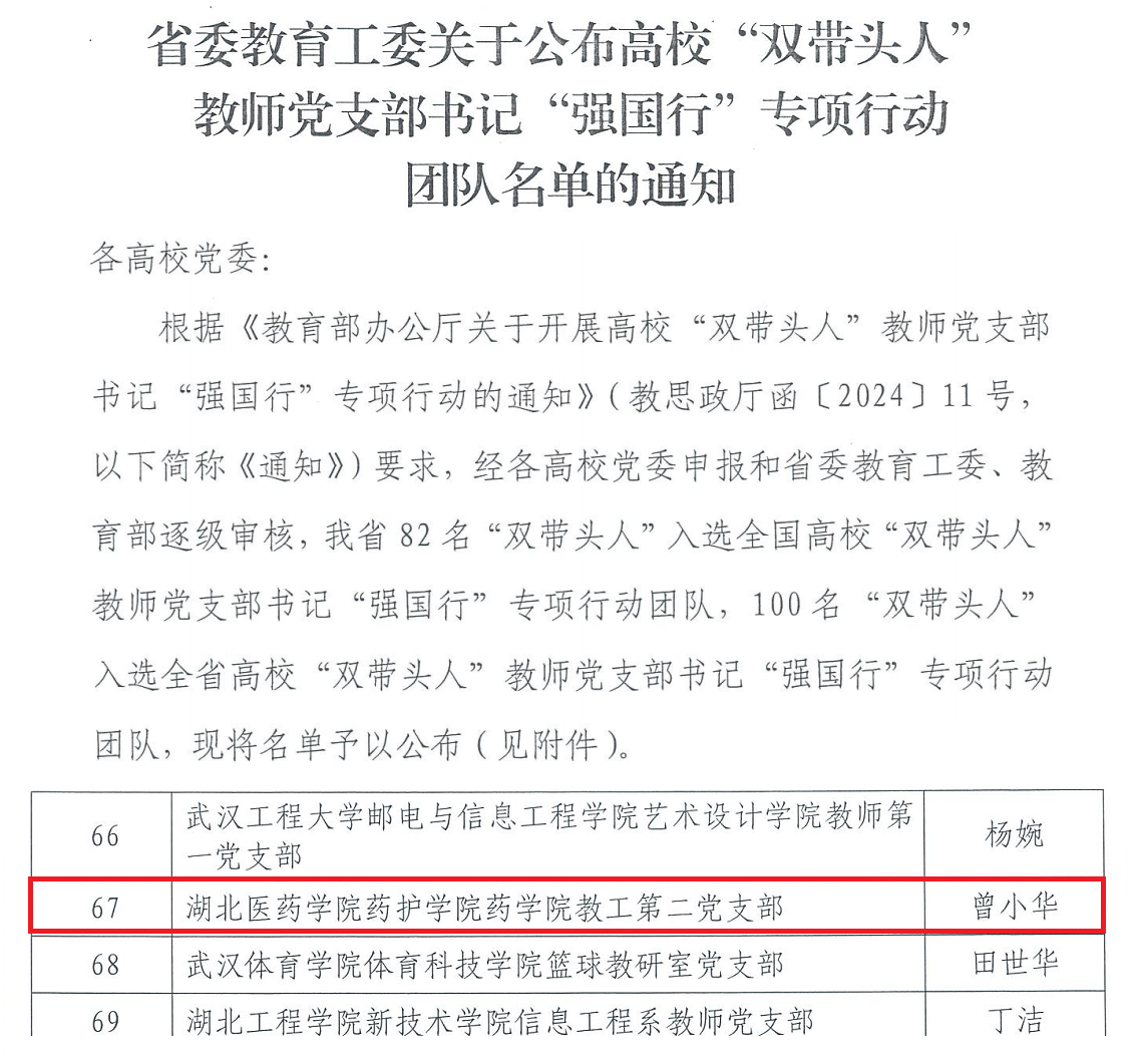 本网讯(通讯员 吴丰旭)近日,中共湖北省委教育工作委员会公布了全省高校“双带头人”教师党支部书记“强国行”专项行动团队名单,我院教工第二党支部成功入选。这是继教工第二党支部先后获得“校级首批‘双带头人’教师党支部书记工作室”、“全省高校‘双带头人’教师党支部书记工作室”后,药学院党委持续推进新时代高校党建“双创”工作提质创优取得的新成果。
