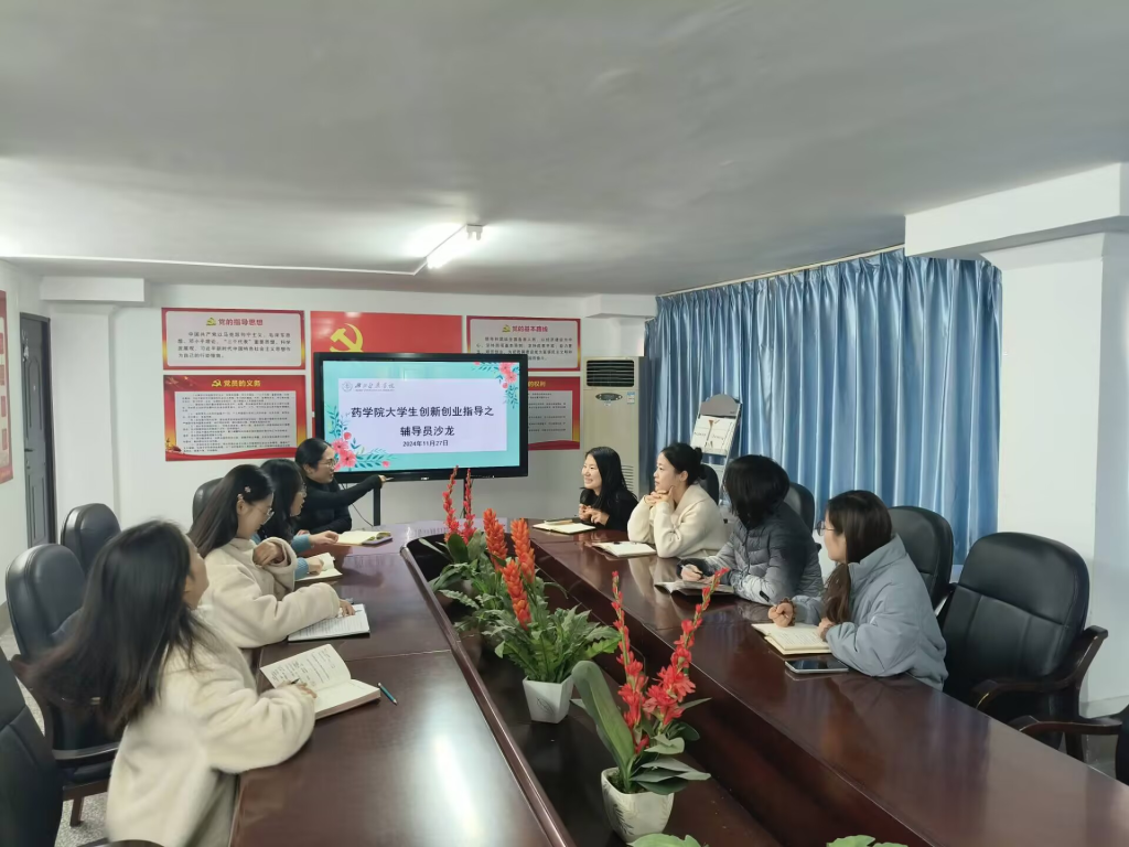 本网讯(通讯员:徐璠婧)为提升辅导员队伍和兼职班主任在创新创业教育方面的能力和水平,药学院于2024年11月27日在党员活动室开展大学生创新创业指导主题辅导员沙龙,深入探讨创新创业教育理念、方法和实践经验,为培养具有创新精神和创业能力的学生提供有力支持。药学院分党委副书记廖婧羽、全体辅导员和兼职班主任参加。