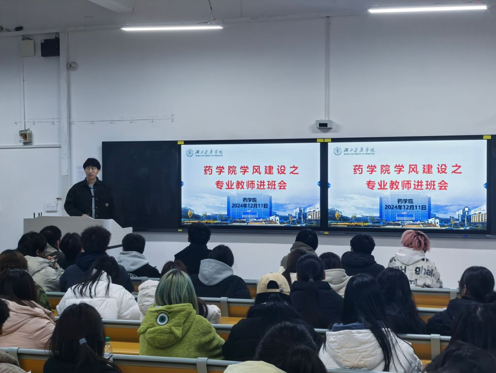 本网讯(通讯员 贺欣如 张玉萌)12月11日晚,药学院开展学风建设暨专业教师进班会活动。本次活动邀请药学院青年博士邓德鑫和李兵主讲,2024级制药工程班全体学生参加。