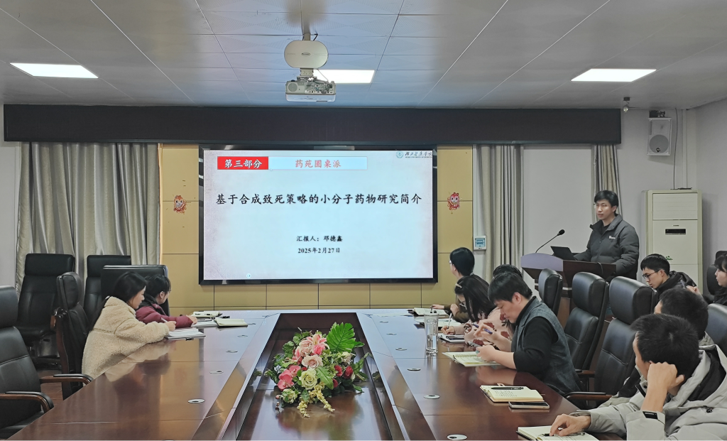 本网讯(通讯员 邓德鑫)2025年2月27日,湖北医药学院药学院教工第一党支部在药学院六楼会议室举办了第六期“药苑圆桌派”特色活动。活动邀请制药工程教研室邓德鑫博士作题为“基于合成致死策略的小分子药物研究简介”的报告,教工第一/二党支部党员群众参加了活动。