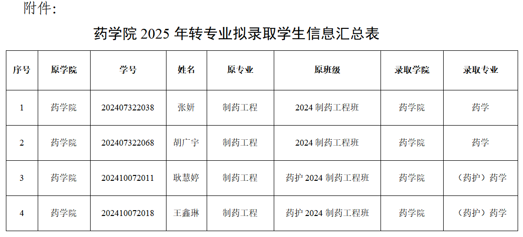 附件:药学院2025年转专业拟录取学生信息汇总表