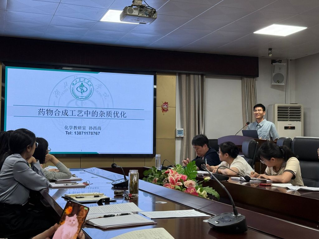 本网讯(通讯员 孙西尚)2025年5月22日,湖北医药学院药学院教工第一党支部在学院六楼会议室成功举办第九期“药苑圆桌派”特色活动。本次活动特邀化学教研室有机化学专业博士孙西尚老师作题为《药物合成工艺中的杂质优化》的专题报告,教工第一、第二党支部党员群众参加了活动。