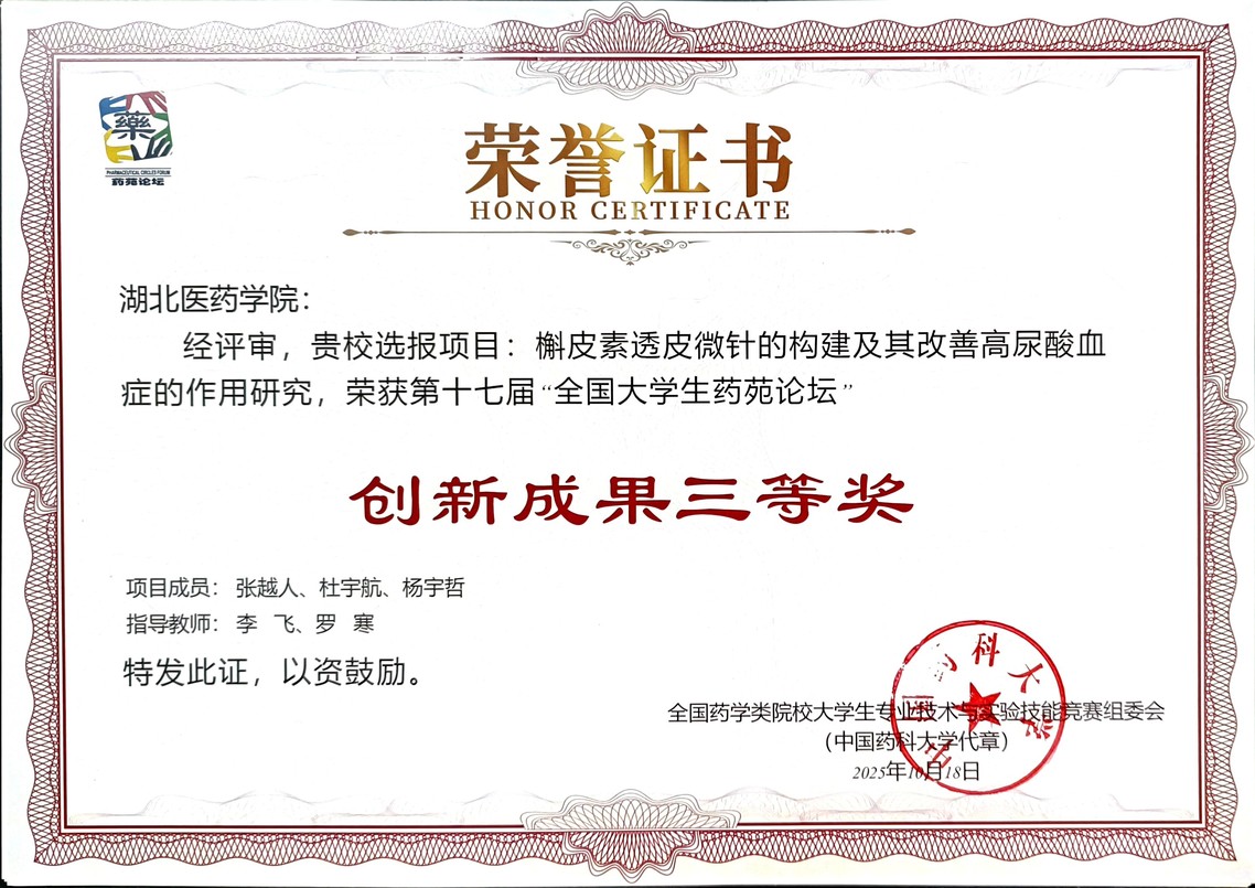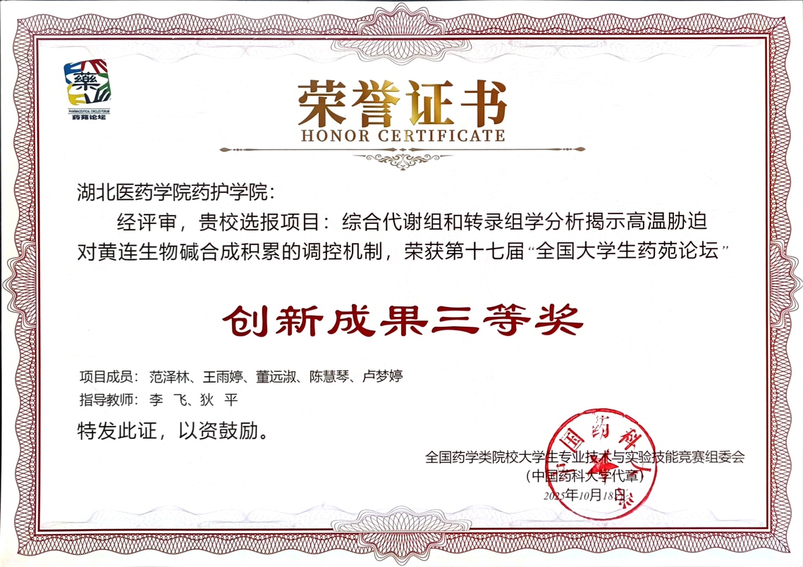 本次论坛设立“药学科学”和“药学服务”两个主题赛道,比赛环节包括壁报交流、论文评选、学生答辩等,经过层层比拼、激烈角逐,药学院推荐的2个项目“槲皮素透皮微针的构建及其改善高尿酸血症的作用研究”(项目成员:张越人、杜宇航、杨宇哲;指导老师:李飞、罗寒),“综合表型、生理、代谢和转录组学分析揭示高温胁迫下黄连生物碱代谢通路响应机制”(项目成员:范泽林、王雨婷、董远淑、陈慧琴、卢梦婷;指导老师:李飞,狄平)均获得创新成果三等奖。