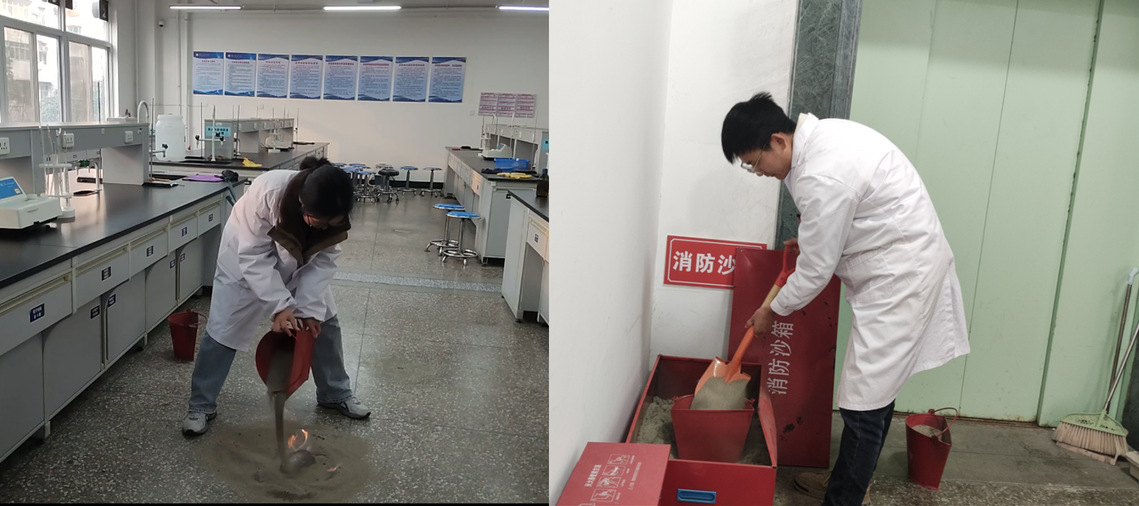 模拟实验中“乙醇试剂起火”突发险情,参训教师按照培训要领依次开展消防沙实操演练。大家沉着冷静、操作规范,熟练完成沙土覆盖、火情控制等关键步骤,切实掌握了易燃液体火灾的初期处置技巧,高效达成“以练促学、以练促防”的演练目标。
